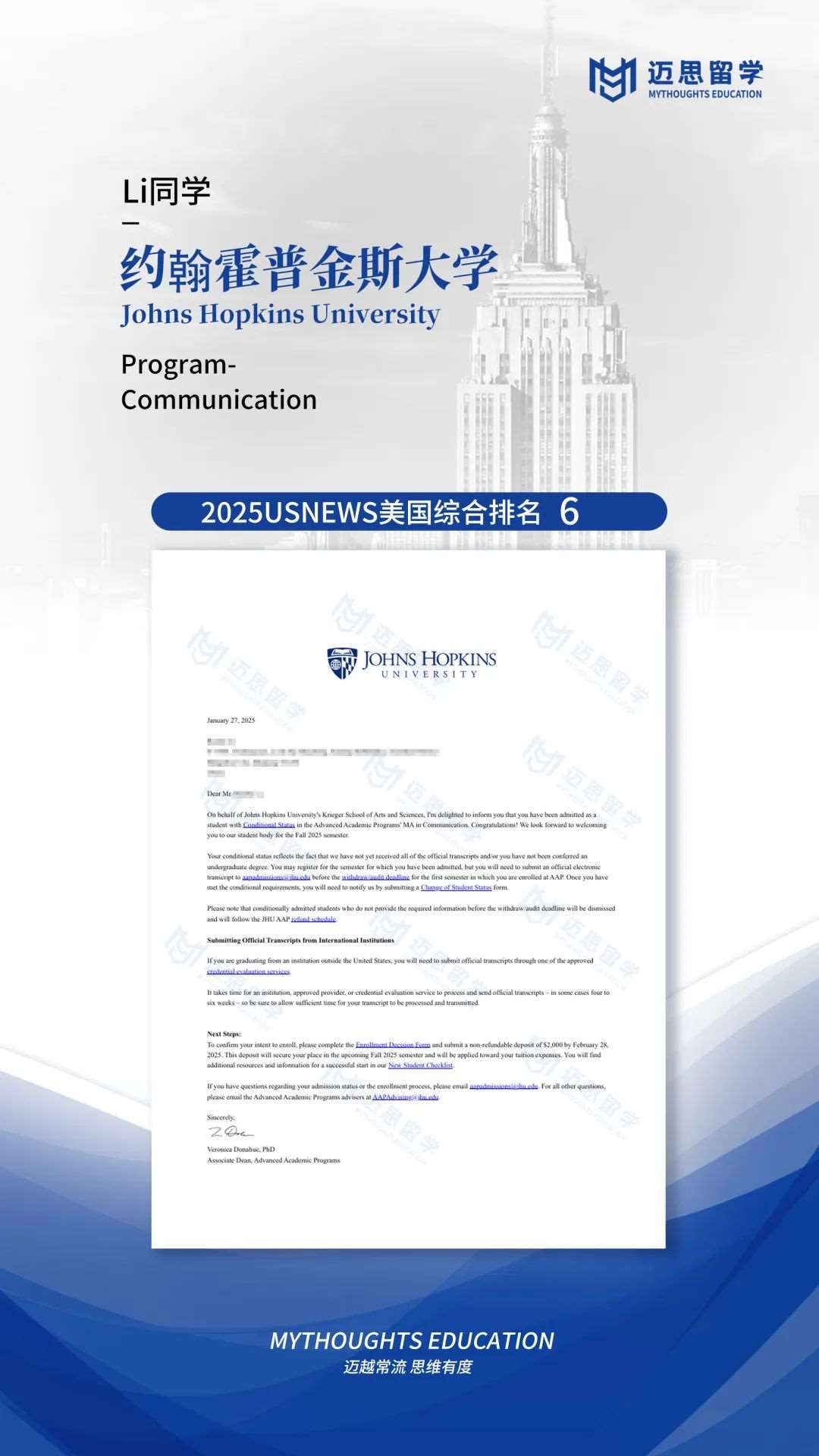 约翰霍普金斯大学|再来三枚JHU的传播学录取,全美第六学府为你们保驾护航~
