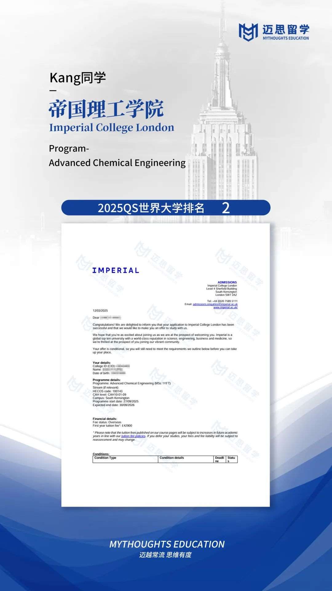 帝国理工学院|恭喜三位同学斩获IC化工专业,顶峰相见吧~